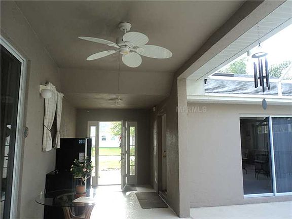 Light and Bright Courtyard model on the Golf Course in Kings Ridge built in 2003. Beautiful landscaping with 4 Queen Palms on this larger lot. Sit out on your back enclosure and enjoy the golf course views. Part of the back belongs to the golf course and is mowed by them. This home has only been used part of the year as both owners were snow birds. Patio furniture and most of the other furniture are negotiable but mounted TV and VCR in Den definitely stays with home. Home could be pretty much turn- key except for decorative and personal items. The home has just been painted on the outside and also the courtyard interior and floor were also painted. Dinette area has new wainscoting on walls. Most of the interior was freshly painted about 2 yr ago and new rods and draperies at that time and new horizontal blinds put in at that time also. The garage is actually a 1 ½ car garage so you can park 1 car and a golf cart. Air conditioner has been gone thru and upgraded electronics put in. Newly replaced water heater plumbing and garage door insulation has been added. Storm door was also added on exterior front enry. Enjoy the Kings Ridge lifestyle with multi-million $ clubhouse with newly redone east wing, 3 heated pools and 2 spas, 2 fitness areas, tennis and pickle ball, bingo, shuffleboard, clubs, cards, dancing and more in this very active clubhouse. One of the big perks of living in Kings Ridge is that you can take your golf cart to the grocery store, banks, eateries and more.