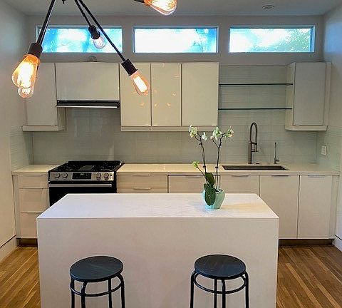 Kitchen with Island, dishwasher, filtered water & quartz counter tops, with private front door porch.