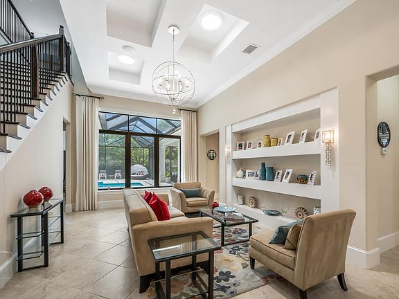 6 month lease minimum required. Nestled in the heart of Naples within the prestigious Grey Oaks gated community, this exquisite Traditions estate offers 4 bedrooms plus a den and 3.5 bathrooms your ideal Naples retreat. From the moment you enter into the grand entryway, complete with an elegant staircase and grand piano, you'll experience effortless flow throughout the home. The living room features a stylish built-in bookcase and large sliding doors that open to the pool area, creating a bright and inviting sitting space. Entertain with ease in the formal dining room, comfortably seating six. The chef's kitchen is a showstopper, boasting custom cabinetry, stainless steel appliances, a wall oven, a spacious island with seating for four, and a separate eating area. Natural light fills the family room through expansive windows, inviting in tropical breezes for a serene ambiance. The luxurious primary suite includes a stately four-poster king bed, sleek tile flooring, and a large wall-mounted TV. The spa-like primary bath offers a soaking tub, dual vanities, and a walk-in shower for ultimate relaxation. Upstairs, a cozy loft landing provides a perfect spot to unwind. Guests will enjoy their choice of three comfortable suites two with queen beds and one with a trundle. Outside is your private oasis: a resort-style pool with a screened lanai, tranquil water feature, and an outdoor kitchen ideal for entertaining. Residents of Traditions enjoy access to two community pools and BBQ grills, while The Club at Grey Oaks enhances your lifestyle with its own resort pool, fitness center with personal trainers, and on-site dining. Live exceptionally in Grey Oaks.