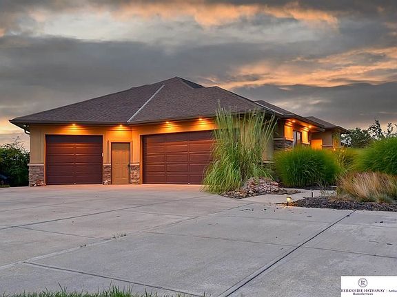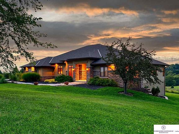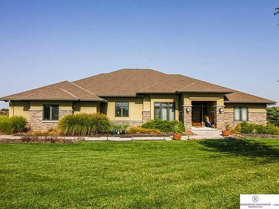 Curt Hofer custom built home on over 5 acres in the Gretna School District. This 1.5 story executive acreage home features 6 bedrooms & 5 bathrooms and is located in the coveted Prairie Ridge Estates subdivision just west of Gretna and near the building site of the new Lost Rail Golf Club. The inviting, open layout on the main level features a large kitchen with quarter sawn oak cabinets, granite countertops and stainless steel appliances. The staircase to the second level is tucked into the back of the kitchen and leads to a private office and bedroom. The enclosed, covered deck allows for year-round enjoyment and unparalleled views of wildlife, sunsets and the horizon. The lower level is setup for entertaining and includes three additional bedrooms and tons of storage space. Geothermal system for efficient heating and cooling and a 1.92% tax levy keeps property taxes low. Huge 3 car garage with a deep 3rd car stall and a 45' x 60' outbuilding already on site provides plenty of room t