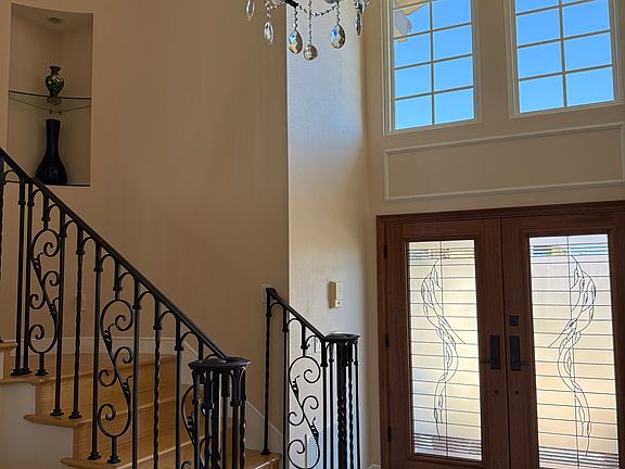 Inside, you'll find 4 spacious bedrooms and 3 bathrooms, including a stunning cathedral-ceiling master suite with dual sinks, a large jacuzzi tub, a separate shower, and a massive walk-in closet. A second bedroom also boasts a large walk-in closet, while the upstairs features an additional oversized bathroom. The grand two-story foyer with sweeping staircase sets the tone, opening into step-down living and dining rooms with soaring ceilings and a cozy step-down family room perfect for gatherings. Ceiling fans are thoughtfully placed throughout the home for added comfort.