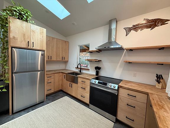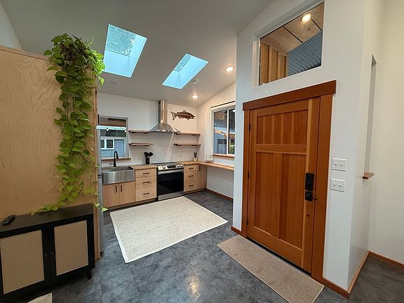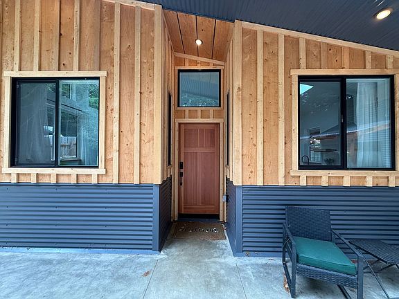 Welcome to this beautifully furnished 2022 custom home in Port Orford! Offering 1,328 sq. ft. of thoughtfully designed living space, this modern single-level home features 2 bedrooms plus a flex space that can be used as an office, third bedroom, workout room, or hobby area, along with 3 full bathrooms. Inside, you'll find vaulted ceilings, an open-concept layout, and a modern kitchen with sleek cabinetry, open shelving, stainless steel appliances, refrigerator, and range. The primary suite includes an ensuite bathroom and a spacious walk-in closet, while sliding glass doors in multiple rooms provide direct backyard access. A washer and dryer are included for your convenience.