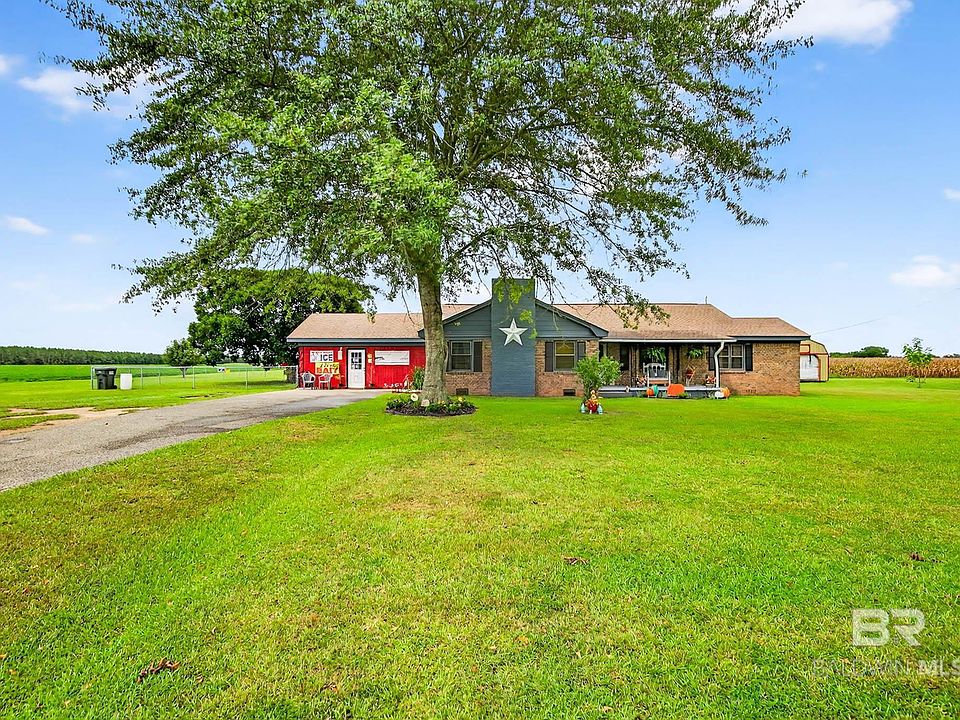 Peaceful Country 2-Acre Homestead Surrounded by Open Fields-Charming brick home featuring a newly renovated tile bathroom. Kitchen and laundry updated with modern light fixtures and LPV flooring. Beautiful original heart pine walls, newly slicked ceilings, and a mix of original hardwood, tile, LPV, and stunning wood plank laminate in the foyer. The spacious living room boasts a cozy gas-burning fireplace with potential to convert back to wood-burning. Well-maintained HVAC system (2018). A cozy area/sunroom leads to the converted garage—once an income-producing bait shop--now an open den area —heated and cooled by a mini split (2022). This versatile space offers endless possibilities for the new owner. Exterior updates include complete replacement of soffit/ fascia boards with a fresh coat of paint in April of this year (2025). This home has a 30 yr. durable three-tab architectural roof (17 yrs old). The property features mature nut and fruit bearing pecan, pear, kumquat, and also oak and magnolia trees, plus a fenced area (2023) for pets. An old barn sits beside a 24x24 open slab ready for your vision. Located in the Baldwin County School District and just a short drive to the Alabama River, Historic Fort Mims, Lake Patterson, and Smith Lake. Call your favorite agent today to SHOW you around! Buyer to verify all information during due diligence.