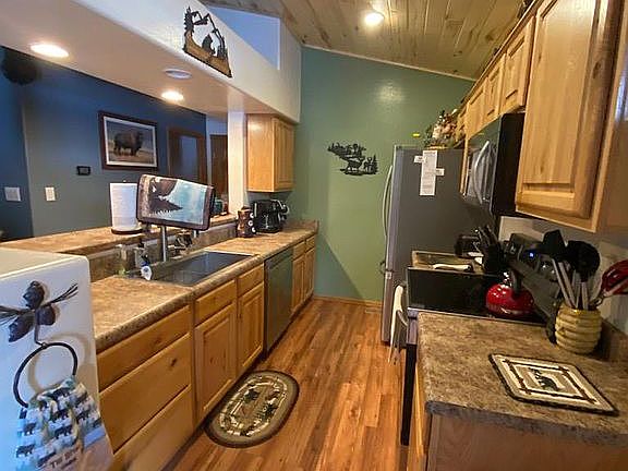 Incredible split bedroom floor plan is just one of the unique features of the cabin home. Master is large w/ bath. The open floor plan is perfect for entertaining with a large dining area. Rocked fireplace. Kitchen offers new appliances and breakfast bar. Utility room is spacious for all the extras. Every room in the home has been recently painted with beautiful Aspen ceilings in the Living room and Kitchen. Saving the best for last: the back yard is newly fenced and is so relaxing with the creek running thru to the pond. Yes it is like you are on water.