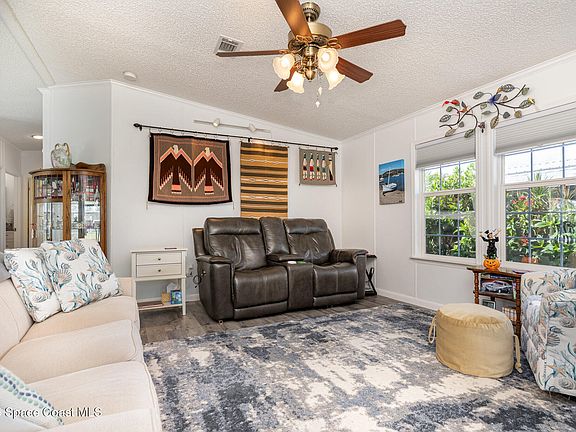 Completely updated and move-in ready 2-bed, 2-bath 2005 manufactured home in the desirable Palm Bay Colony, a 55+ community where you own your land and enjoy no mandatory HOA. Every detail has been thoughtfully remodeled for easy, comfortable living. Relax on the front porch where you can watch rocket launches from Cape Canaveral, or unwind on the back patio swing surrounded by lush Florida landscaping. The home and lot are the perfect size for enjoyment and low maintenance. Friendly neighbors, a true sense of safety, and convenient access to shopping, dining, the river, and the ocean make this a wonderful place to call home.