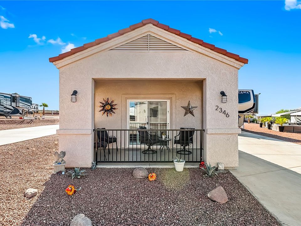 Own your slice of paradise in Vista Del Sol! This beautifully designed 1-bedroom, 1-bath home offers 606 sq ft of living space in Bullhead City s premier 5-star 55+ gated RV resort community. The open floor plan features a modern kitchen with stainless appliances, granite counters, and white shaker cabinets. Light and bright interior with upgraded flooring and stylish finishes. Enjoy your morning coffee on the cozy covered front porch or entertain on the expansive patio. The bedroom includes ample storage and direct access to the full bath with walk-in shower. An additional space for parking utv, golf cart, storage, or workshop use. Vista Del Sol offers resort amenities including two pools (one heated year-round), spa, pickleball courts, fitness center, woodworking shop, dog park, clubhouse, and endless social activities. Perfect for full-time living or a winter getaway near the Colorado River, Laughlin casinos, and desert trails.
