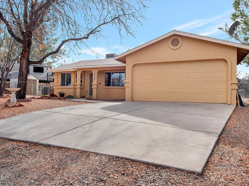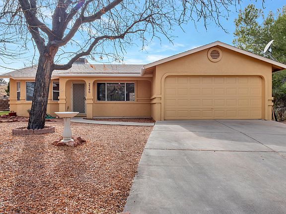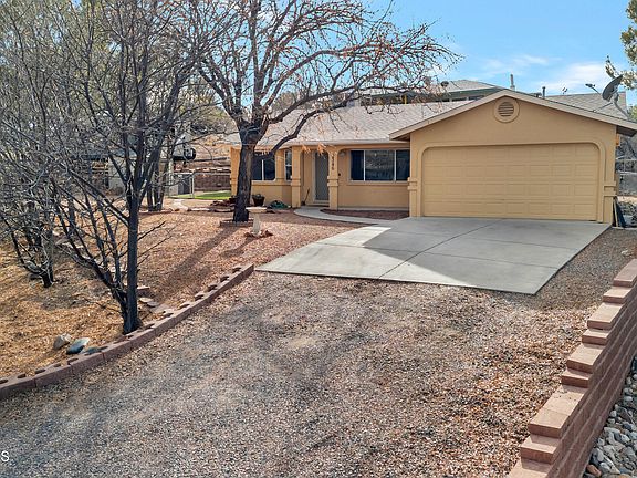 This approximately 1,246 square foot house features three bedrooms and two bathrooms. The property offers ample outdoor space, including RV parking, a shed, and a fenced backyard with artificial grass. Roof is only a few years old! The spacious lot provides scenic red rock views a sense of efficiency. The home's well-maintained exterior extends to a covered back patio and offers robust Mingus Mountain views.