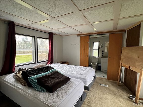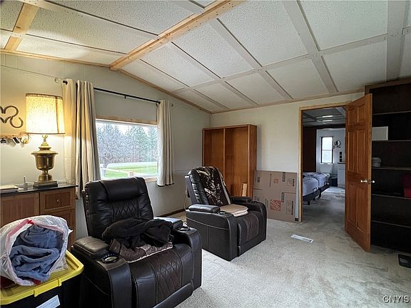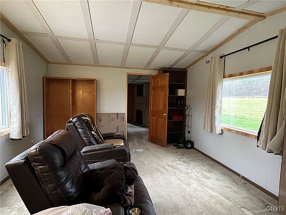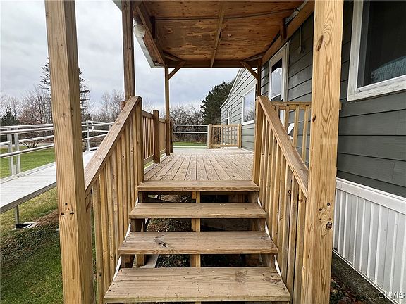 Ranch-style home on an acre of land for under one hundred thousand?! This 2 bedroom 2 bathroom home is located on a quiet country road, just minutes from the airfield entrance for Fort Drum. There is a sturdy 2 car garage with enough room for a shop, as well as extra storage areas built around it. The front porch was recently upgraded and truly "beefed up"! There is a handicap ramp installed that is "like new", or a new owner could easily uninstall. The yard is flat and beautiful, surrounded by pastures. The previous owner has spent a lot of time clearing brush, and making this an inviting space. The owner has also upgraded the skirting around the home to cement block with added insulation. Previously, this was the standard interlocking metal sheets. This along with putting extra insulation on the inside of the house, creates a cozy home and an energy bill that is easier on the pocketbook. This home has more to offer than can be put in this description, all at a price point that is well below the area's median. This home is a single wide mobile home, but don't let that scare you. We have tracked down options that will allow the home to be purchased with a conventional loan, as well as FHA and VA financing. Contact your agent to find out how!