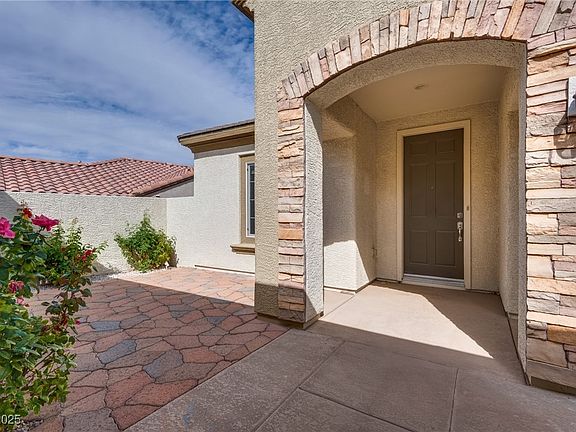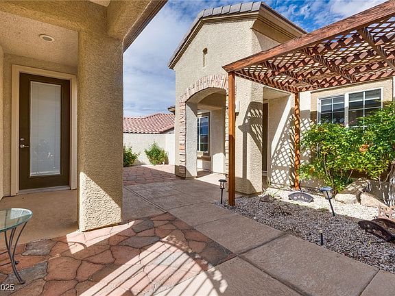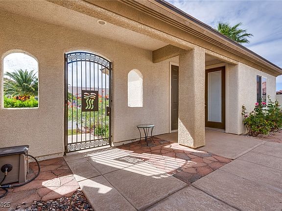 Las Vegas needs Water, literally and figuratively. The gate to this house has hieroglyph word, Water. Nice touch. Gate is part of Custom-built breeze way, connecting golf cart garage and casita. Casita, with bath, adds 240 sq ft of space and potential 4th bedroom. Breeze way and casita creates Zen garden and rose courtyard. House, facing west, on elevated ground, has panorama view of Black Mountain. Columbia model has 3 bedrooms, 2 full baths, den, separated by pony wall, and formal dining room. Breakfast area, next to kitchen, has 3-sided view. Stovetop is Bosch, and ventilation is more powerful. All rooms have ceiling fan/lights. Laundry area has solar tube along corridor. Original upgrades include fireplace, taller kitchen cabinets and diagonal 16x16 tiles. 2 ACs are replaced within last 5 years. Resins in Culligan water softener is replaced 2 years ago. Fresh painted and ready to move in. Move into community with tons of activities for active residents.