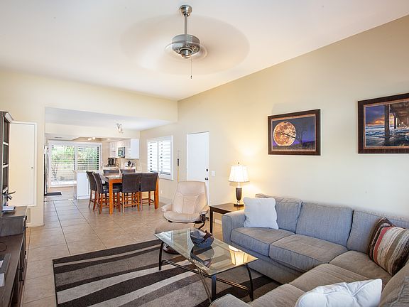 One of the very few single story condo's with no one above or below you. Updated kitchen including quartz counters. Bathrooms updated with new shower in master bath. Perfect distance from the pool. Beautiful mountain views out of your huge front sliders. Complex is surrounded by Tahquitz Creek Golf Course. Trader Joes's, Vons and Walmart right down the street. Has a nice private walled rear patio located off the kitchen.