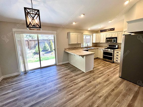 This unfurnished home is located in Shevlin Meadows, a super walkable neighborhood and very close to Shevlin Park and the restaurants and shops in Northwest Crossing. Built in 2004, this property was lovingly upgraded last year and it will feel like walking into a brand new home! Just look at this list of improvements: recently painted kitchen cabinets with new hardware; new stove and refrigerator; all the flooring has been replaced with beautiful and durable luxury vinyl plank; all baseboards and walls and fireplace mantel have been painted; storage cabinets have been installed in the laundry room; and new plantation shutters and blinds have been installed throughout the home. The living room and master suite have vaulted ceilings, giving the home a great sense of space. The large living room window lets in tons of light and the room is anchored by a re-done gas fireplace, now with a stone surround and beautiful stone hearth. The open floor plan flows into the kitchen and white cabinets help create a bright, clean look. You'll love using the five burner gas stove with built-in double oven! On one side of the home you'll find the master bedroom large enough for a king bed and an en suite with double sinks and walk-in closet. Down the hall on the other end of the home are two bedrooms, a bathroom with a tub and two hall closets. The laundry includes a front loading washer and dryer and even more storage! Enjoy single-level living, an open floorplan and a private, fully-fenced backyard. The large, covered front porch looking out to the grassy front yard with mature birch trees and is the perfect place to hang out and wave to neighbors and appreciate this west side gem.