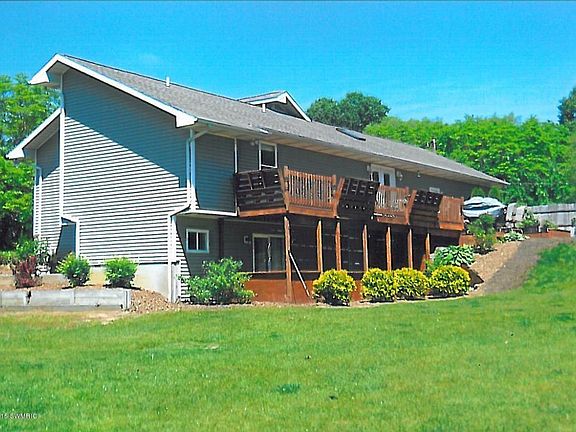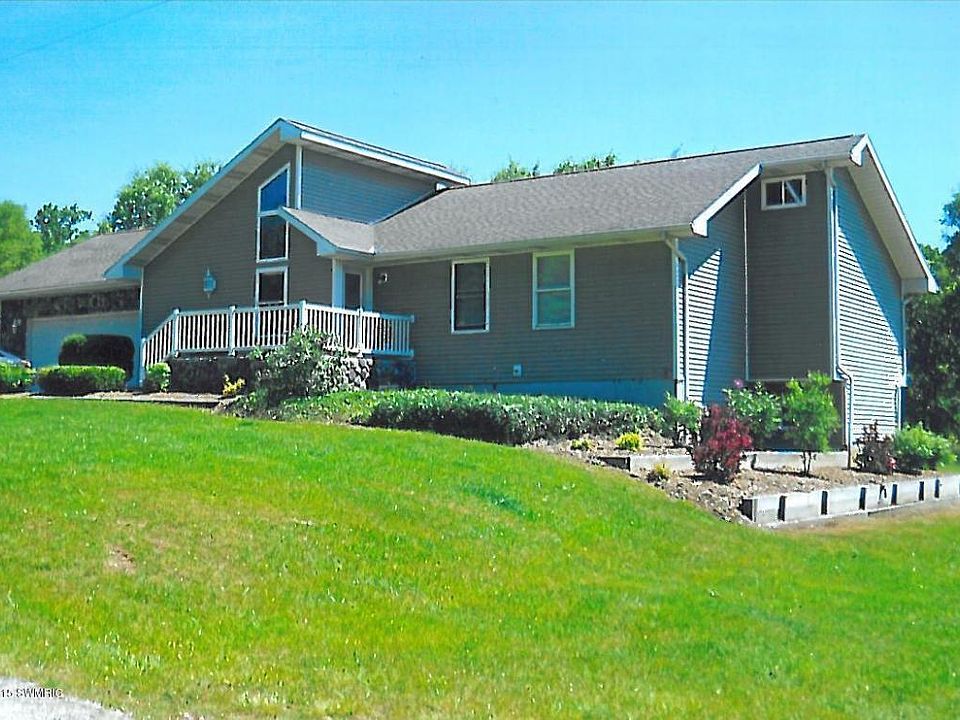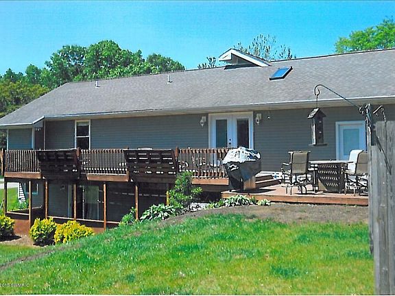 Quality built modern four bedroom, 3 bath ranch sitting on over an acre with fully finished walkout basement including a 26 X 48 partially insulated/heated out building w/10' ceilings and two story kids play house with electricity. Multi-level upper decking 7.75'X 38' plus 12'X 12'plus with lower level 7.5' x 28' concrete patio. 90%+ gas furnace w/central air, owned water softener, vaulted ceilings in living/dining and master bedroom. Full wet bar in lower-level recreation room w/slider and egre ss window from LL bedroom, hard surface counter tops, gas firplace. NEW CARPET THROUGHOUT!Pool table stays!!