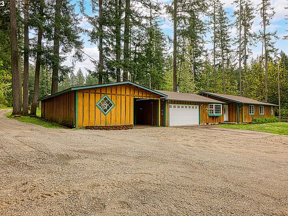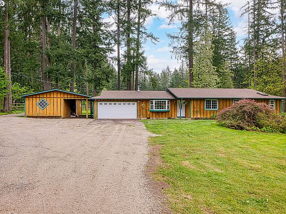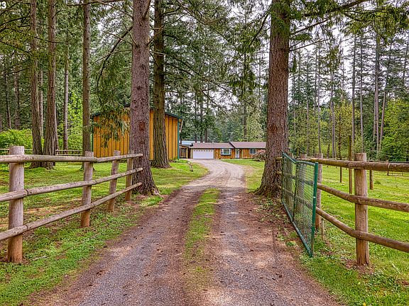 ( Open house cancelled.) Rare find in Oregon City near Beavercreek! One-level home sitting on 5.01 fully fenced acres that are private, quiet, and in a serene location. Bring your vision of how you can update this home with your taste and style! This home offers a single level with 3 bedrooms/ 2 full bathrooms and several skylights throughout. French doors in both the family and primary bedroom lead to an extended back deck facing the back yard, perfect for entertaining, with picturesque wooded views and pasture access. Or enjoy the tranquil views from inside the large circular eating area with HUGE windows. The generous primary bedroom also features a walk-in closet that has a hidden "secret room" perfect for storage or putting valuables in! The seller spared no expense when building the high-quality shop and horse barn. The large shop is approx. 30x48 w/concrete floors, a workbench, a large storage loft, and high doors perfect for an RV, horse trailer, boat, tractor, or to park all of your toys. Very clean inside! The beautiful semi-open barn is one of a kind and an equestrian/critter lovers dream featuring 3 matted stalls w/feed doors and removable dividing walls, a luxury insulated tack room, concrete hay storage/feed room, and covered tractor or implement parking area and is inside the fenced pasture. The level pasture flows to the front of the property to the apple orchard and small creek and rests beside an expansive garden area. Partial farm deferral too. The property is gated at the front for privacy. Just a few miles from town but with country living at its best.