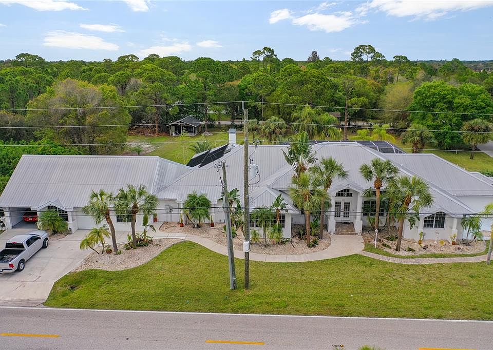 The stuff that dreams are made of. Stunning, 5 bedroom, 3 bathroom, custom built, multi-generational pool home with potential mother-in-law suite(s). The perfect home for large families, with room for an RV, boats, toy storage, and no deed restrictions. This palatial home sits on 4 lots - more than 1 acre total - complete with separate covered outdoor cooking area, storage shed, ample parking, play area for the kids, and enough yard for a football game. As you enter the home, you are greeted with a formal living room, perfect for entertaining, with sliding doors to the pool area. A formal dining room sits off the spacious kitchen, with an additional full-size media/family room on the opposite side, also overlooking the pool. Home features a 3 car garage, eye-catching ceramic tile throughout the house, a garden room with skylight, spacious game room/man cave featuring an inviting bar area, cozy upstairs loft, and a wood burning fireplace. Kitchen offers an oversize pantry and gas stove, while the master bedroom features a sitting area, 2 roomy closets, oversized glass block shower, granite countertops, his and hers sinks, and garden jacuzzi tub. Oversized pool deck with pool bathroom and multiple access points provides yet another ideal setting for time with guests. Metal roof features newly-installed energy-saving solar panels. Potential to subdivide or build accessory dwelling. Convenient access to Interstate 75 and nearby golf and boating in Punta Gorda, as well as shopping and dining in Port Charlotte. Schedule an appointment to experience this special home today!