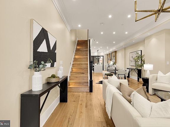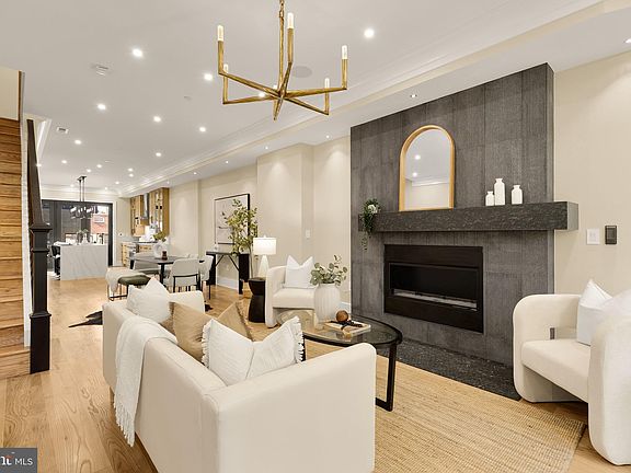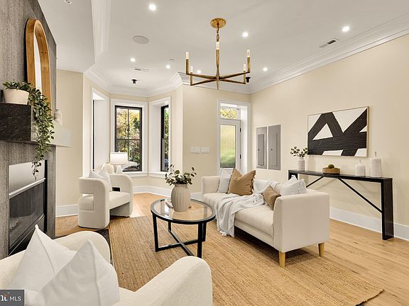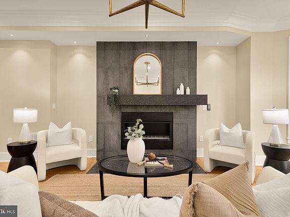 On a tree-lined block by Lincoln Park, this classic Capitol Hill row home has been fully reimagined by Kittrell Homes—marrying historic architecture with modern comfort across 2,845 SF, 4 bedrooms, 3 full baths, 2 half baths, and garage parking. Thoughtful finishes and systems upgrades include 7-inch oak floors, Restoration Hardware lighting, Farrow & Ball paint/wallcoverings, whole-home audio, and smart controls for everyday ease. The main level flows from a bay-front living room with gas fireplace to open dining and a chef’s kitchen with quartz counters, waterfall island with bar seating, workstation sink, LED-lit cabinetry, and a JennAir suite. Steel-framed glass doors extend the living space onto the rear deck. Upstairs, the second floor offers two bedrooms, each with an en-suite bath, plus hall storage and laundry. The top-level primary suite is a private retreat with walk-in closet, en-suite bath, wet bar with wine fridge, gas fireplace, and a private balcony—a rare perch above the treetops. In total, all bedrooms feature en-suite baths for uncompromised privacy. Out back, the carriage house above the detached garage adds true flexibility: a climate-controlled bay with EV-ready wiring and a 300 SF finished loft with kitchenette (microwave + wine fridge) and a half bath plumbed for a full bath—ideal for an office, studio, gym, or guest overflow. Behind the scenes: three 2025 HVAC units (three zones), a 75-gallon hot water heater, smart thermostats, and exterior security cameras—delivering efficiency and peace of mind in an A+ location moments to Eastern Market and Metro.