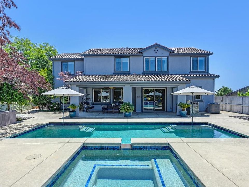 This exceptional Blackstone home rests on a premium lot with a serene green belt backdrop, offering natural beauty and privacy. The resort-style yard invites you to unwind with a heated saltwater pool and spa, an outdoor kitchen perfect for entertaining, and garden paths bordered by flourishing fruit trees mandarins, Meyer lemon, lime, peach, nectarine, passion fruit, pineapple guava, and even a young pomelo tree. Inside, the open and thoughtful design includes a downstairs bedroom and full bath, ideal for guests or multi-generational living. Upstairs, a spacious loft creates the perfect media or game room. The primary suite offers sweeping views and features a spa like bath, walk-in closet with a new custom organizer, and every comfort you'd expect. Additional highlights include a 3-car tandem garage, owned solar, and a gated entry with exclusive access to the Blackstone Clubhouse complete with pools, spa, fitness center and neighborhood events. Explore walking trails just outside your door, all while staying minutes from Town Center shopping, dining, top-rated schools, and daily conveniences.