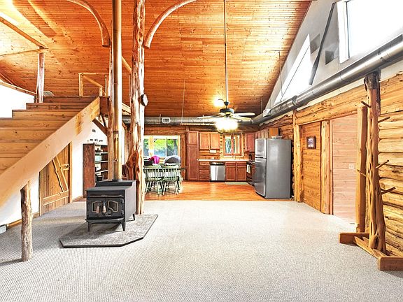 Waterfront pondOpen living spacesGenerous windowsVaulted ceilingsNatural wood finishesRustic warmthCovered porch