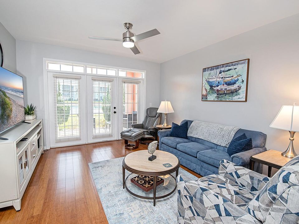 This light and bright ground-floor unit is three bedrooms, two baths with fully-equipped quartz kitchen (all dishware and kitchen gadgets included), new dining room set, living room with recliner and agronomical chair/ottoman plus utility room with full-size washer/dryer. Its private Southern exposure screened patio overlooks the serene pool and community pond, complete with fountain and walking path. This unit is nicely decorated with relaxing blues and greys having all of the appointments to make you feel at home, including flatscreen HDTVs in all bedrooms and living room. FREE WiFi is available in the unit and at the clubhouse/pool too!