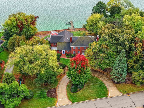 Water frontageBrick colonialGrand entrywayFull wall of windowsBuilt-in china cabinetsVol ceilingGl fp
