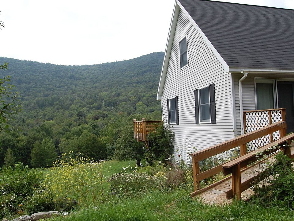 Driving down the tree-lined lane to reach this home feels like a step back in time. The lane dead-ends a little way beyond the house at the access point to Goose Egg Stste Forest which the home overlooks. This ten year old Cape is built into a hillside with a full walkout lower level, plus a second floor in-law studio apartment, fully applianced. Both an interior and seperate exterior access give the potential for use as guest quarters or a rental income. FIRST FLOOR: Entry foyer into vinyl floored mudroom with coat closet. Huge walk-in kitchen pantry. Kitchen: Frigidaire side-by-side refrigerator/freezer, Kenmore dishwasher, Jenn-Air gas range top with grill and electric oven, countertops and back splash are ceramic tile, built-in microwave, and large L-shaped island with seating. Open floor plan. Dining area with overhead light. From here a French door leads to the front deck with a handicap ramp. Living room has oak floors, ceiling fan, large closet shelves. A full glass storm door opens onto rear deck. Custom crafted corner entertainment unit. Master bedroom with double closets and full bath. LOWER LEVEL: Down carpeted stairs to the lower level with tall ceiling. Finished except for the utility room, this area features a spacious FAMILY ROOM and built-in bookcases. The exterior door leads to the front lawn. TWO MEDUIM BEDROOMS with large closets and ONE SMALL BEDROOM without a closet. Family room and bedrooms all have wall-to-wall carpeting. FULL BATH has vinyl floor, oak vanity, one-piece fiberglass tub/shower. The ceiling is ten feet high with a two foot acoustic tile drop ceiling which gives access to all plumbing, heating/cooling and electrical wiring. UTILITY ROOM has a large stainless steel utility sink, storage shelves and washer/dryer hookup; laundry chute from first floor bath. The refrigerator here is owners and washer is tenants. Heating system, sump pump and oil tank are also located here. SECOND FLOOR: From main level go up the carpeted stairs to the STUDIO APARTMENT. KITCHEN: Walnut cabinets, ceramic tile countertops, back splash and wall. Stainless steel sink, whirlpool dishwasher, Tappan built-in microwave, GE electric range and pantry cupboard. LAUNDRY AREA with washer and dryer. FULL BATH with linen shelves and lots of storage in recessed shelves. Fiberglass tub/shower. Vinyl floor. STUDIO AREA contains sleeping and living and dining areas. A whole wall is walnut built-in cupboards with storage space. Separate exterior entry via staircase. SUPER QUALITY CONSTRUCTION throughout. Oak floors and all custom pine woodwork came from trees on the land. All solid six-panel doors. ELECTRIC: 200amp circuit breaker entry HEAT: Oil hot water baseboard, Crown Boiler with Beckett Burner, Amtrol Boiler Mate has a separate zone off the boiler. WATER: 400' deep well with submersible pump. OTHER FIVE ZONES: First floor, lower level each bedroom and one for bath and family room. 275 gallon OIL TANK in basement and separated by a brick fire wall from the boiler. CENTRAL AIR via ceiling vents in first and second floor. Floor vents are returns for central air. WINDOWS: Anderson wood, double hung, thermopane. SEPTIC: Natural gravel bed in front of house is leach field 1,500 gallon tank. HIGH SPEED INTERNET: access via satellite. HEAT AND HOT WATER OIL USAGE: 600-650 gallons. FOUNDATION SIZE: 40x28. 2240 square feet total for first floor and lower level. Second floor apartment is 640 square feet. ROOF: 25 year fiberglass shingles over plywood. NYS Building code exceeded. Built with double the amount of baseboard heat required, and also doubled the number of outlets. OVERSIZE TWO-CAR GARAGE: 22x31x12' high, 682 square feet. 2007. 50amp sub-panel. Cement floor. 50 year quality metal exterior guaranteed not to rust. The FOUNDATION utilizes Arxx Insulated Concrete Forms (ICF's)