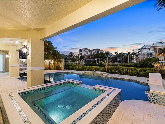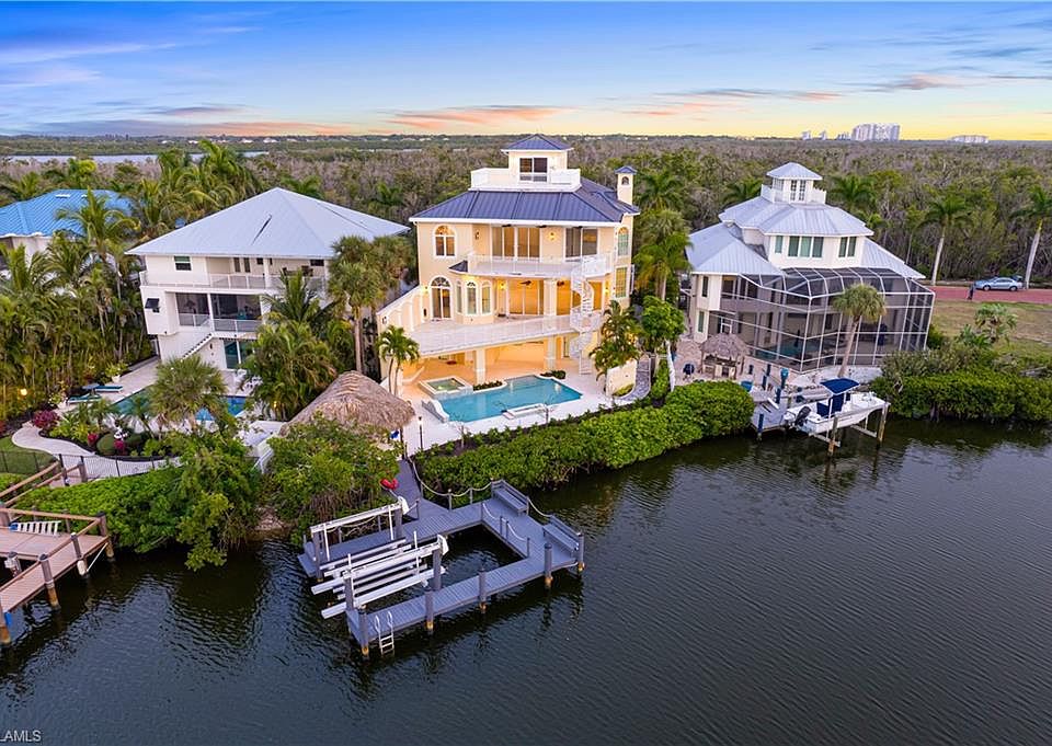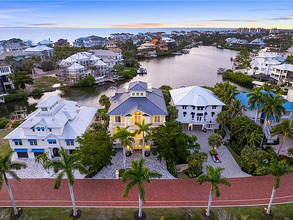 4% FINANCING OFFERED BY SELLER!*Spectacular coastal living in Barefoot Beach’s premier gated enclave. Experience the epitome of coastal luxury at this extraordinary residence, nestled in the exclusive double-gated Bayfront neighborhood of Barefoot Beach. With panoramic Bay views, direct boating access to the Gulf, and deeded beach entry just steps away, 235 Bayfront offers a lifestyle defined by elegance, comfort, and coastal sophistication. This 5-bedroom + den, 5.5-bath, 4-story estate features a heated saltwater pool and spa with new equipment, outdoor shower, and tiki hut with a summer kitchen and bar seating—perfect for entertaining or relaxing in style. A private boat dock with new motors and controls allows for a 10-minute ride to the Gulf, and the beach is only a 5-minute walk away. The home showcases extensive upgrades, including a new elevator, impact doors/windows, electric shutters, whole-house water purification system, generator with 500-gallon buried propane tank, six HVAC units, newer water heater, Moen smart water shutoff, and central vacuum system. Interior highlights include a refinished first floor with new flooring, woodwork, and doors, two full laundry rooms, plantation shutters and oversized windows throughout, a 2-story great room with soaring ceilings, and an expansive primary suite with breakfast bar. The top-level “cloud room” with a custom bar offers the most breathtaking Bay views, complemented by balconies on every level. Located in a quiet, gated enclave where homes line only one side of the street—offering unmatched privacy and unobstructed water views. Optional membership to the exclusive "Club at Barefoot" provides access to tennis, two restaurants, beachside food and beverage service, and more. Conveniently located near fine dining, RSW Airport, Mercato, and Waterside Shops, and just 15 miles from the renowned Fifth Avenue in Naples, this home is a true gem in the heart of Bayfront Gardens in Barefoot Beach. Elegant, functional, and move-in ready—this is elevated waterfront living at its finest.