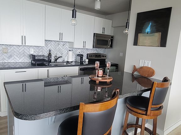 Water front viewTop floor unitCustom walk in showerCustom tile backsplashStainless steel appliancesGranite counters
