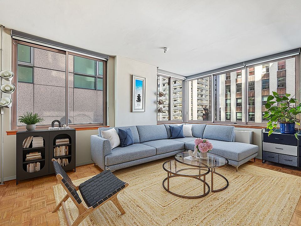 Welcome to this lovely, high floor one bedroom home at The Vanderbilt, one of midtown’s sought after luxury condos. With its extra long living/dining area and its triple exposures, this highly desired layout allows the flexibility to convert to a two bedroom, allowing the perfect work at home solution. The kitchen has been renovated with an extended stone countertop, wooden cabinetry and stainless steel appliances. The bathroom has been completely renovated, resulting in an ultra chic look with additional cabinetry. Fantastic storage has been added throughout the apartment with custom built-ins in the living room, bedroom and kitchen; perfect for city living and a great way to maximize the space! There are city views throughout, including the iconic Chrysler Building.