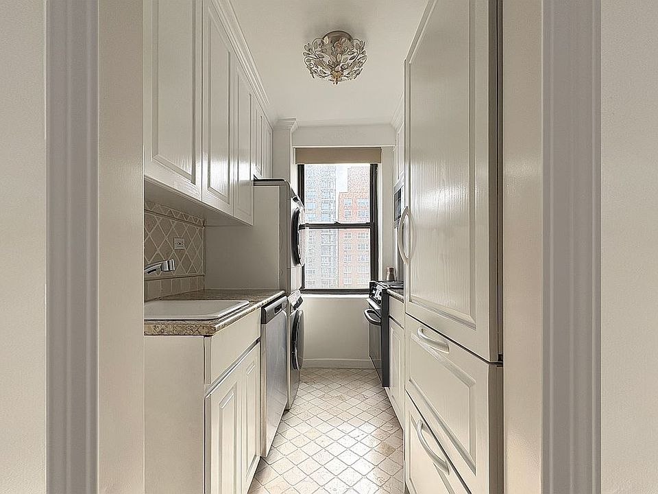 Renovated Kitchen and Bath: The windowed kitchen has marble countertops and includes a full-size washer and vented dryer. New stainless-steel appliances and white cabinets. The windowed bathroom features hand-formed Italian tile and Water Works fixtures, combining style and functionality.