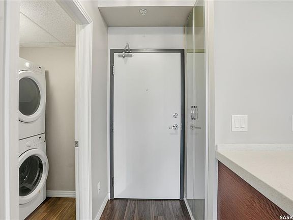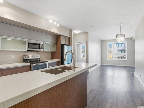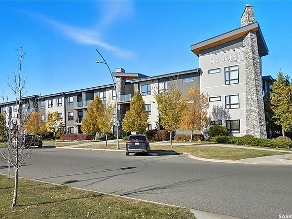 Excellent 2-bedroom, 2-bathroom east-facing condo with 2 parking spots (1 underground, 1 electrified surface-level) at Sequoia Rise, great location close to the Evergreen Square & bus routes to U of S. This trendy suite offers a functional layout with 9' ceilings, SoHo-style kitchen with quartz countertops and eating bar, ample living & dining space, in-suite laundry, split bedroom layout with generously-sized primary bedroom featuring walk-through closet to a beautifully-finished 4-piece ensuite with sit-down shower & dual sinks on a vastly-sized quartz-top vanity. A sheltered environment awaits you at the balcony, offering a relaxing space to soak up the sunrise with your morning coffee! Excellent climate control with in-floor zone heating (included in condo fees) & central air conditioning, providing gentle heating with the benefits of air handling. Building amenities include elevator access, intercom with cell phone compatibility, common exercise area & meeting room, visitor parking & mailboxes. Pet-friendly condo subject to restrictions. Whether you're looking to downsize, looking for economical living or buying your first home, this great condo should be on your list!
