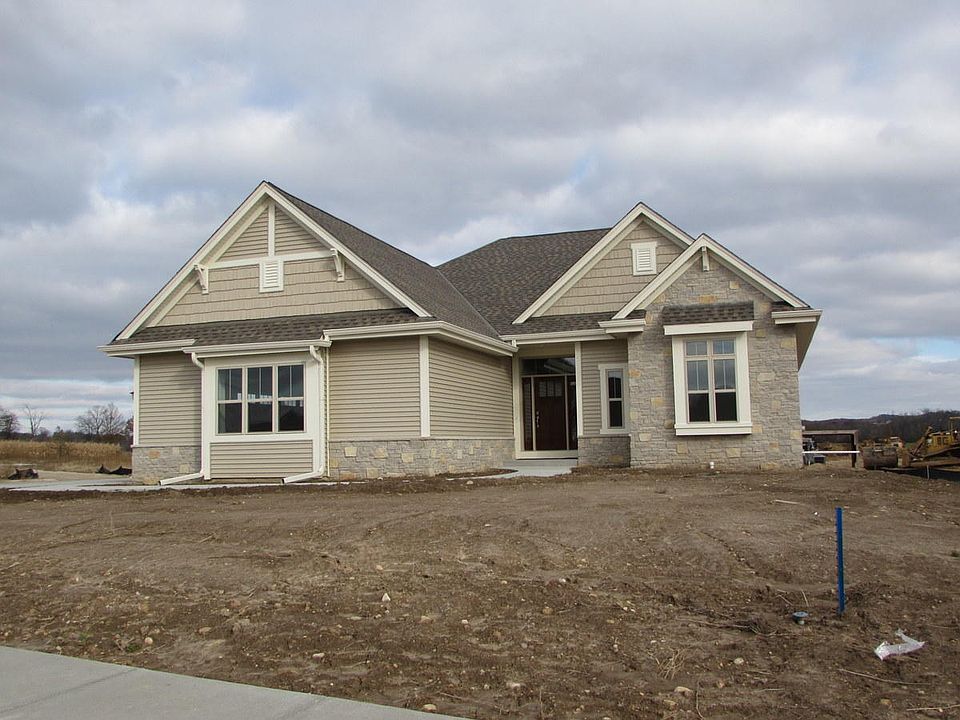 New Construction! Custom/quality-built Split Ranch in popular Farmstead Creek. Custom, Amish built cabinetry, granite c-tops in kitchen and all 3 baths, wood floors, ceramic tile. Open-concept great room with gas fireplace and coffered ceiling. Ten foot ceilings, and transom windows offer open-airy ambiance. Master bedroom has tray ceiling with crown molding and bump-out window, and master bath has double sinks, huge tiled shower. Front bedroom has bump-out window and walk-in closet. Patio door off dinette leads to composite deck. Laundry/mudroom with bench and storage for convenience. Look-out basement with full-sized windows is plumbed for a bath and ready for your imagination. 3 car, extra deep garage. Minutes to freeway, schools, shopping and more.