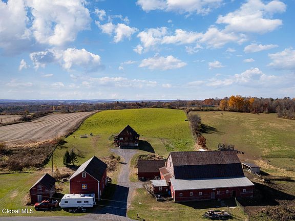 One of a kind LOG HOME, equestrian property overlooking the Mohawk Valley. This custom cabin with almost 20-acre farm, offers meticulously maintained 2432 sq/ft. Boasting white cedar logs, open concept Great Room w/ 29' high vaulted ceilings, stone and custom tile. Spacious kitchen w/ large island, perfect for entertaining. Offering 2-3 bedrooms and 2.5 baths. New upstairs full bath (2025). Main level owner's suite has en-suite bath w/ jetted tub & laundry. Gorgeous views from the wrap around deck. Green efficiency w/ owned solar electric, solar hot water, radiant heated floors. Large outbuildings w/ plenty of garage space and storage. Large horse barn w/ 8 beautiful stalls, tack room, heated feed room & bathing station. Fruit-bearing trees, old 2-story hop-house, chicken coup and more.