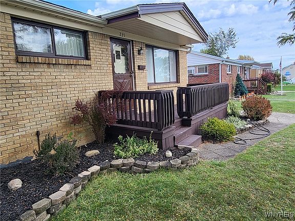Talk about location ! This Ken-Ton brick ranch is located close to everything. Minutes from Sheridan Dr shopping, Hertel Ave life, Downtown excitement. All brick with a beautiful yard has access to bonus lot next door (seller has easement). Large front porch deck was stained in summer 2025. Nice covered patio overlooks a beautiful treed and private yard with shed and 1 1/2 car garage. Kitchen has updated cabinets with neutral ceramic backsplash and eating area. Large, bright sunny living room. Three generous sized bedrooms are also a huge amenity. Updated first floor bathroom in neutral tones makes decorating easy. Lots of closet space and storage abound in the first floor living area and basement. Speaking of basements: this basement is large and partially finished for added living space; all shelving, cabinets are included. Basement stove, washer, dryer stay with the house. PLUS = the basement has a very nice full bath with shower. Furnace installed within past 5 years. Offers due October 29th at 6 pm.