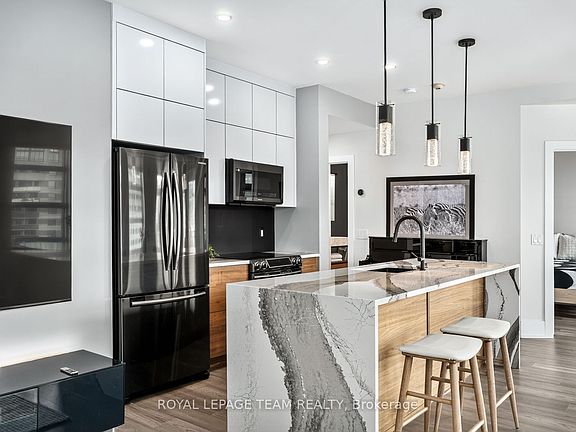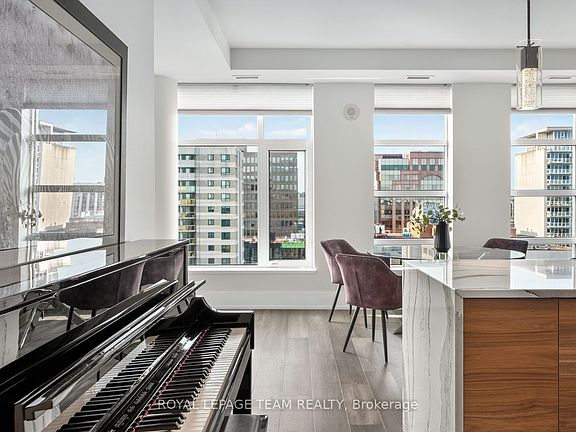 Experience refined urban living in this fully renovated 19th-floor corner penthouse at Hudson Park. Floor-to-ceiling windows frame breathtaking panoramic views of downtown Ottawa the moment you walk in. This sun-filled, open-concept layout features wide plank hardwood floors, a balcony, and a stunning custom kitchen with a one-of-a-kind quartz island, black quartz backsplash, luxury appliances, and sleek cabinetry - designed for both entertaining and everyday elegance. The spacious primary suite includes a sunken walk-in closet and spa-inspired ensuite with a rainshower. A second bedroom and full bath offer flexibility for guests or a home office. Hudson Park, built by Charlesfort Developments, is known for its Art Deco - inspired design and solid construction. Amenities include a rooftop terrace with BBQs and skyline views, fitness centre, lounge, indoor parking, and two landscaped courtyards. Steps to Lyon LRT, Parliament, shops, cafés, and the river pathways - this is a rare opportunity to own a truly exceptional home downtown.