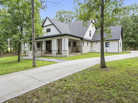 Welcome to 235 Kings Ct.! This custom-built 2018 residence sits on nearly 6 acres. As you enter, you're greeted by soaring 26 ft. ceilings and a floor-to-ceiling tiled wood-burning fireplace. The gourmet kitchen boasts wood and white slow-closing cabinetry, porcelain tile slab countertops, a tile backsplash, eye-catching light fixtures, and expansive island seating at one of the two islands. Adjacent to the kitchen, the dining room features a large bay window with seating and storage. A spacious mudroom off the garage entry adds convenience.The main floor master suite features a large walk-in shower, walk-in closet, double vanity, and custom cabinetry with a built-in vanity. An additional bedroom, guest bathroom, and powder room complete the main level. The beautiful wood staircase with iron railing leads to the second floor, where a built-in desk feature awaits. Upstairs, you'll find three more bedrooms, a full bathroom with double vanity and walk-in glass shower, a designated office, and another living space. The home is adorned with masterfully installed tongue and groove oak floors.Designed for modern living, this home features dual zoned HVAC with two 16 seer heat pumps with propane backup along with high-efficiency spray-foam insulation, ensuring a low electric bill. The property also features a 500 gallon underground propane tank, and is plumbed for a central vacuum. The craftsman-style exterior includes a large covered front porch and a screened-in back porch, perfect for relaxing in the serene, park-like setting.Additional amenities include a three-car garage, a 30amp RV connection, a custom chicken coop, and a garden. Only a few minutes from Ozark Elementary East, this property is located with convenience in mind. With multiple living spaces and a built-in theater system room, this home is ideal for both entertaining and everyday living. Don't miss the opportunity to witness the gorgeous sunset views from this property!