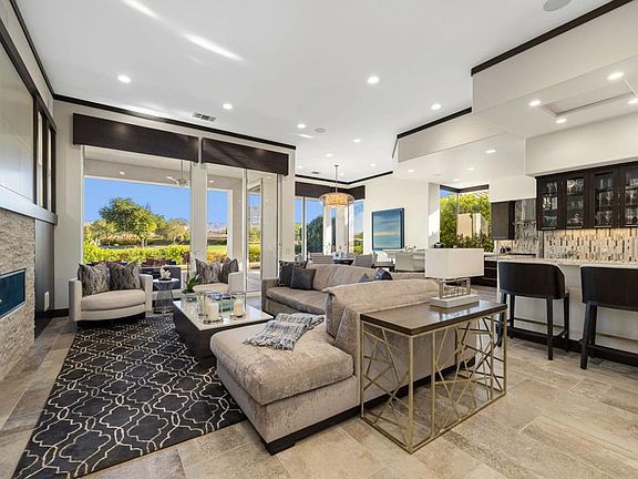 Stunning Contemporary Update of popular Legacy Open Great Room Floorplan with mountain, lake and fairway views and great outdoor living with lap pool. Enter a gated courtyard with outdoor living area and contemporary glass door entry. Open Great Room, Kitchen and Dining complete with entertainer's wet bar, fireplace and walls of glass with amazing views. Social Kitchen features quartz countertops, stainless appliances, counter seating and Dining area with views. Interiors by noted designer including custom tile flooring. Primary Suite features access to pool and spa terrace and more views together with updated spa bath with quartz and marble finishes. One guest suite in house featuring ensuite bath and a Detached Casita are perfect for friends and family. Den/Office with french doors to the courtyard can be a second guest bedroom in house with custom powder room nearby. Outside is a covered outdoor living room, pool and spa, updated expansive terraces with stone flooring, fire pit, bbq area and views of the mountains, fairways and lake. Legacy HOA includes Mission Hills Country Club social/fitness membership. Furniture Negotiable, so could be ready for a season in the sun - Come home to your desert retreat!
