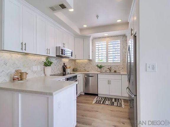 Unique Marina District 3 bedroom with so much to offer. The optional 3rd room is great for an office, nursery, or small bedroom. Enjoy brand new LVP flooring, a remodeled kitchen, fresh paint,2 assigned side-by-side underground parking spaces with a private EV charger, and 2 patios with panoramic city views. The primary suite features a walk-in closet, dual sinks, a large soaking tub, and a separate shower. Amenities include gated building, elevator access, gym, rooftop BBQ patio, and courtyard patio. Mid-rise building is located close to grocery store, restaurants, cafes, convention center, trolley access, Seaport Village, Gaslamp, San Diego Bay and more!