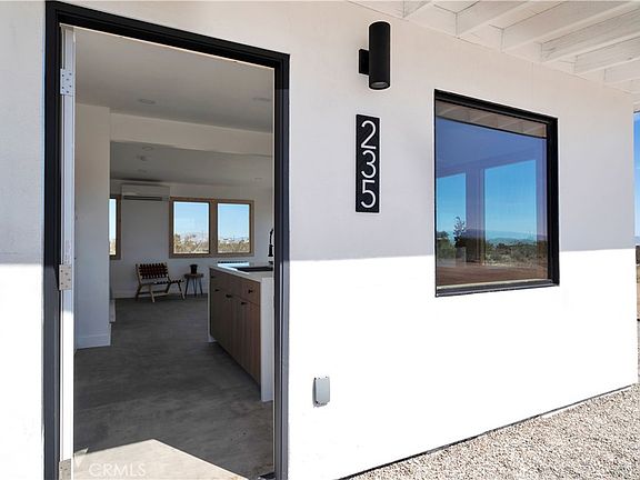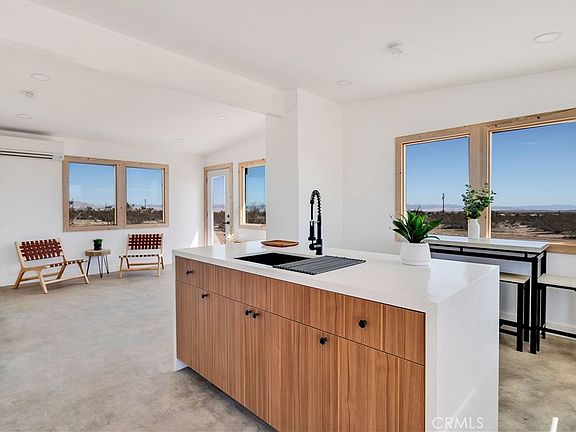 Everything is ALL NEW in this gorgeous 2 bedroom, 1 bath Landers home on 2.5 Acres! Fully remodeled and permitted, this house has been taken all the way down to the studs and updated with all new roof, new full plumbing, all new electric (including new panel), new septic, new insulation and drywall, new windows, new lighting, new appliances, new water heater and more! Step inside to find yourself in a generous open concept living space with new polished concrete floors that flow throughout the home, large banks of windows to let in plenty of natural light and views, and new mini-splits to provide perfect zoned heating and cooling. You'll love that the home has been remodeled with the latest finishes for a sleek, modern vibe. The kitchen and dining area has been lavishly appointed with custom cabinets, beautiful quartz countertops with stylish waterfall edge, all new appliances, and an island with sink in black stainless steel! In the spacious bathroom, you'll encounter a floating vanity in finishes that match the kitchen, and an oversized shower fully tiled in gorgeous marble tile. You'll find each of the two bedrooms to be airy and inviting with its own private sliding door access to the outside, large walk-in closets finished with fashionable barn doors, and their own mini-splits. The primary bedroom also enjoys jack-and-jill access to the bathroom for your convenience. Meanwhile, outdoor laundry hookups are located just outside on the back patio of the second bedroom. In this location, you'll enjoy unparalleled desert serenity while still being only 20 minutes to downtown Joshua Tree! This incredible home would be perfect for either a primary residence or vacation rental - the possibilities are endless, so book a showing today to see this hi-desert gem for yourself.