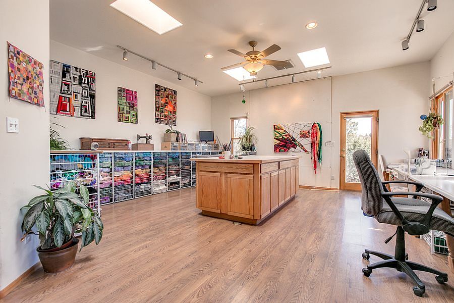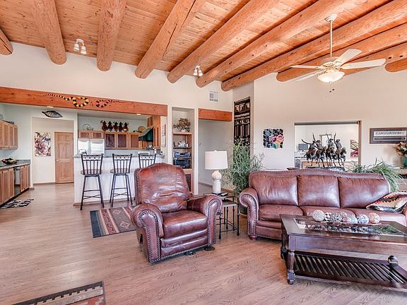 Rancho Alegre is a sophisticated subdivision with paved, county maintained main roads where the views are forever. Located off the scenic Turquoise Trail on a 10+ acre corner lot this 2500 sf custom built home, large 500 SF heated workshop suitable for an RV, auto mechanic [with pit], pottery studio or welding shop/studio has something for everyone; includes bunkhouse with loft. BD, BA, small kitchenette. The main house features 3-4 bedrooms, 2.5 baths, in-floor radiant and forced air heating system, central AC, wood burning kiva fireplace in main living area & master bedroom, two car garage, and a true indoor studio space of 360 sf with access form main house of a separate entrance and terrific light. The studio & design area is presently used by world renowned quilt designer and artist. Nearly 500 sf of scenic portal area wrap around the house to views and pond of koi fish. The large 500 SF heated outbuilding and bunkhouse is extremely versatile. Large overhead doors, oversized storage rooms, mechanics pit, work benches, perfect studio space and more. Attached separate entrance to Rustic bunkhouse with fully functioning kitchen and full bath offers on-site accommodations for friends and family. Hike/walk or horseback from the house through numerous arroyos or over the under populated rolling terrain of natural vegetation. To truly appreciate the uncompromising views of Rancho Alegre please take a moment to view the attached virtual tour