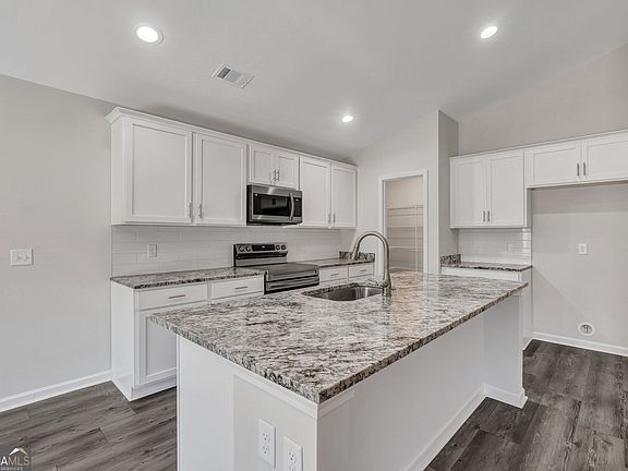 The Aspen plan by Smith Family Homes is under construction in Hayden Pointe with an estimated completion date of April 2026. This 1,733 square foot plan features an open kitchen and living space with 11-foot vaulted ceilings, a spacious primary suite with dual sinks and walk-in closet, two secondary bedrooms, and a covered back porch. Included are LVP throughout the home, granite/quartz countertops, and a fully sodded and irrigated yard. Stock photos shown; to be similar but not identical.