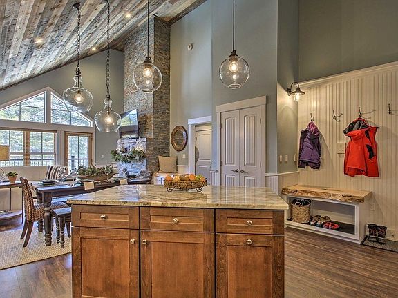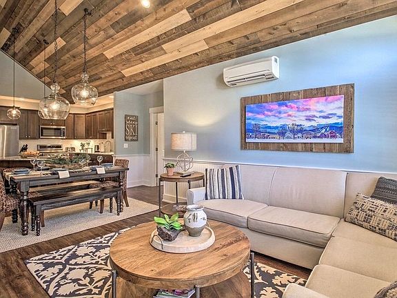 Welcome to 1401 at the Kearsarge Brook Condominiums at Cranmore! This stunning, penthouse style, top-floor residence has room for the whole family. Located right at the base of the renowned Cranmore Mountain Resort in the heart of North Conway, you'll be just steps from the ski lifts and year round resort activity. Built in 2016, this beautiful residence is filled with exquisite details throughout. Sunlight pours through the windows, the gorgeous stone to ceiling fireplace creates a wonderful ambience, and the state of the art kitchen has stainless steel appliances, beautiful stone countertops, and room for all to gather. This top floor residence has an incredible reclaimed barnwood vaulted ceiling, beautiful live-edge built ins, luxury vinyl plank flooring, and many upgrades throughout. The spacious primary suite offers a large bedroom, beautiful shower/tub combo, and double vanity. The full guest bathroom is conveniently located between the other two bedrooms. Offered fully and beautifully furnished with in unit laundry. Owners may opt to join the onsite fitness center and year round outdoor heated pool and hot tub. Excellent rental history, and no rental restrictions. Schedule a tour today!