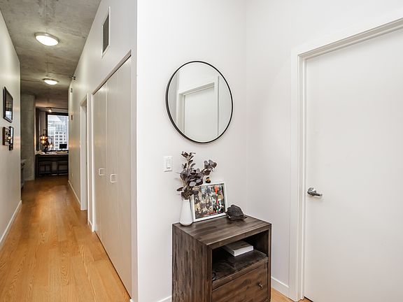 Experience urban living at its finest in this spacious and stylish one-bedroom home-the largest in the building! This beautifully designed residence features soaring exposed concrete ceilings, sleek hardwood floors, and an open-concept layout that maximizes space and flow. A long entry hallway leads past the bathroom and bedroom into a modern kitchen equipped with stainless steel appliances, ample cabinetry, and space for a dining table-perfect for creating an eat-in kitchen. The inviting living area is bathed in natural light, showcasing dramatic downtown views, track lighting, and exposed concrete pillars. Step out onto your private balcony to take in the city skyline. Additional highlights include a convenient computer alcove-ideal for a home office or extra storage-as well as an in-unit washer and dryer. Enjoy top-tier amenities, including a 24-hour doorman, security, on-site management, dry cleaners, Amazon Lockers, a grocery store, bike room, and storage. Plus, enclosed temperature-controlled garage parking is included! Nestled in the heart of downtown Chicago, this prime location puts you just minutes from world-class dining, shopping on Michigan Avenue, Willis Tower, nightlife, expressways, Union Station, the CTA/EL, and so much more. Don't miss your chance to call this incredible home yours-schedule a showing today!