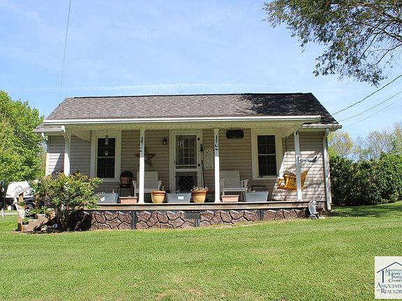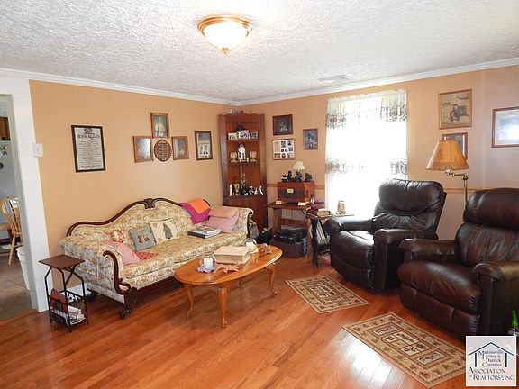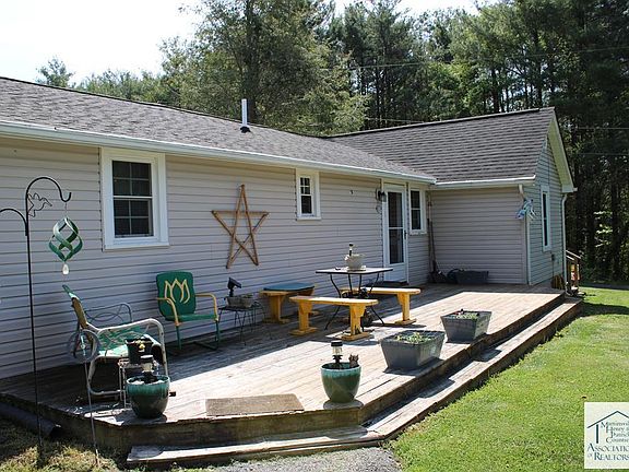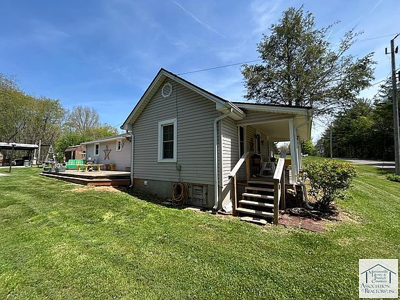 This delightful, low maintenance 3 BR/2 BA farmhouse boasts a welcoming rocking chair front porch. Inside, you'll find a charming eat-in kitchen equipped with stainless steel appliances. Beautiful hardwood flooring flows throughout the home, with tile in the bathrooms. Updates to include replacement windows, insulated floors, 2021 Trane heat pump, updated ductwork, and gutters. The appeal extends outdoors to a large deck and the backyard features an awesome covered shelter with concrete flooring, creating a fantastic space for grilling & entertaining guests. Large level lot with fruit trees & grape vines. An added bonus is the nice view of the hillside from the driveway. For your storage needs, there is an equipment shed with a concrete floor and a wired storage building. Buyers please be aware that the newest storage shed and backyard swinging porch chair does not convey with the home.