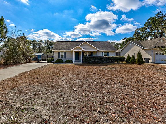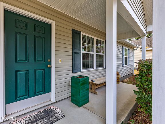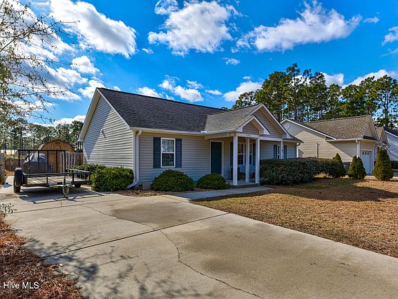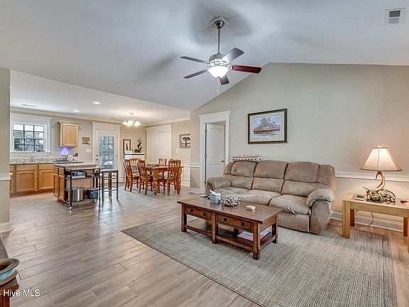 Extremely well maintained and shows like new, this beautiful 3-bedroom, 2-bath home offers comfortable one-story living with thoughtful upgrades throughout. The open floor plan is highlighted by LVP flooring, crown molding throughout, and a vaulted ceiling in the living room that creates a spacious feel. The kitchen flows seamlessly into the living and dining areas and features granite countertops, a tile backsplash, center island, and built-in vented microwave. Wainscoting adds character to both the kitchen and dining room, and a door off the dining area provides easy access to the covered patio and backyard. The split bedroom floor plan offers privacy, with brand-new carpet in all bedrooms. The spacious primary suite features a tray ceiling, large walk-in closet, dual raised vanities, and a gorgeous tiled walk-in shower in the primary bathroom. Enjoy peaceful pond-front views from the huge covered back patio, or relax on the covered front porch while taking in coastal North Carolina weather. The fully fenced backyard includes a large wired detached shed/workshop (12x18) with a 15-amp RV plug. Additional highlights include a 2020 HVAC system and exceptional overall condition throughout.