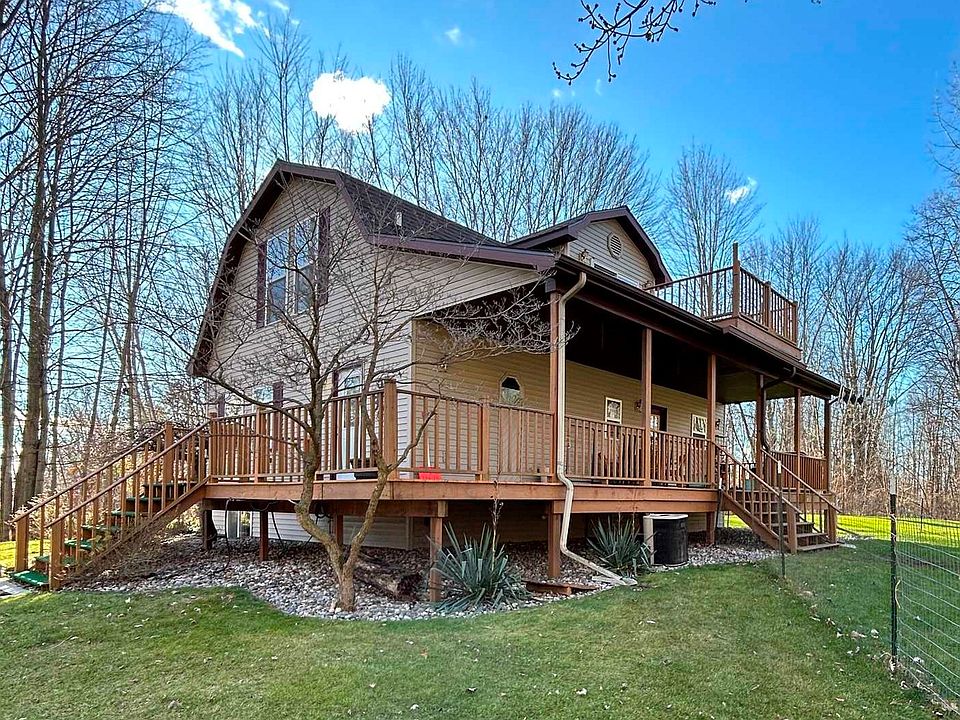 This serene 4.2-acre property offers a beautiful, well-maintained three-bedroom home set back off the road, ensuring privacy and tranquility. Surrounded by mature trees, the property provides a peaceful, country-like setting with a stunning pond that adds to the natural beauty of the landscape. The home sits nestled among the trees, offering seclusion and the perfect retreat from the hustle and bustle of everyday life. The thoughtfully designed home features a spacious layout, with two bedrooms located on the lower level, offering easy access and plenty of privacy. Each floor of the home is equipped with a full bathroom, including a convenient bathroom on the lower level and a luxurious, well-appointed bathroom on the upper level, ensuring comfort and ease for all residents and guests. The highlight of the upper level is the expansive master suite, which occupies the entire floor. This private retreat offers ample space for relaxation, with a deck that overlooks the pond, providing a stunning view of the water and surrounding nature. It's the perfect spot to enjoy a morning coffee or unwind in the evening while soaking in the peaceful scenery. The main floor features a well-lit living room, a dining area, and a functional kitchen, with an open layout that’s perfect for family gatherings or entertaining. Large windows throughout the home allow natural light to flood the interior, creating a warm and welcoming atmosphere. For those in need of extra space for vehicles, storage, or hobbies, the property includes two large garages: a 24x40 garage for ample vehicle and equipment storage, and a 24x24 garage that can be used for additional storage, a workshop, or other recreational needs. The lush, wooded acreage is a haven for nature lovers, providing privacy and a serene environment. The pond adds a touch of tranquility and offers a picturesque backdrop to the property. Whether you're enjoying time outdoors, relaxing on the deck, or working in one of the garages, this property offers a perfect balance of comfort, functionality, and natural beauty. With its spacious home, peaceful surroundings, ample storage space, and beautiful pond, this property provides an exceptional opportunity for those seeking privacy, space, and a true retreat from the world.