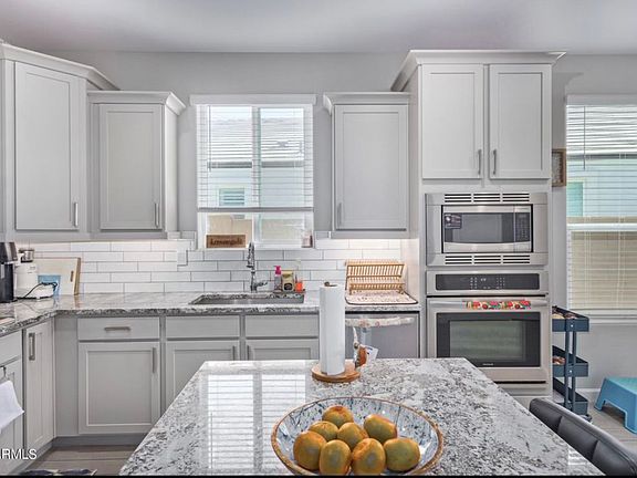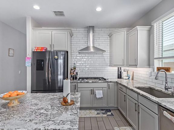 The kitchen is a true centerpiece, boasting built-in stainless steel appliances, sleek gray cabinetry, granite countertops, and a stylish subway tile backsplash.