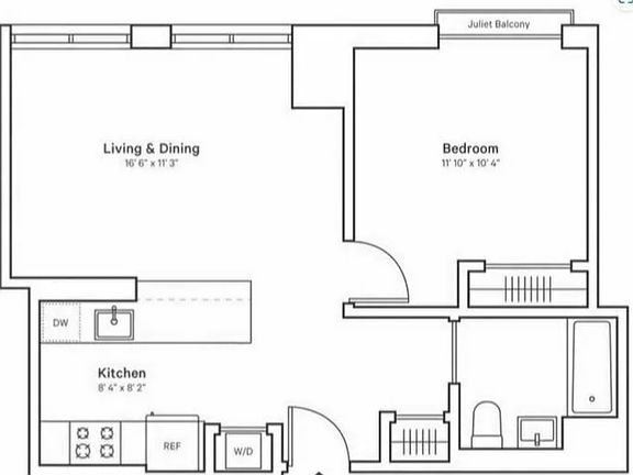 This newly constructed one bedroom accommodates the living as well as the dining areas. It is an amazing spacious layout that is perfect for entertaining guests. It boasts two large floor to ceiling windows with great views of the century building.