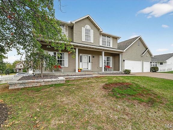 Welcome to this beautiful and spacious 2 story home in O'Fallon! This home has everything you are looking for and more! Step onto the charming covered front porch as you make your way into the entrance foyer with beautiful LVP flooring throughout the main level! You will be greeted by lots of natural light in this home, with formal dining space and a front room with built-in shelving that can be used as an office or play room! Step into the spacious living room with 9 ft ceilings and a charming gas fireplace that flows into a beautifully designed kitchen featuring granite countertops, custom cabinetry, a sunlit breakfast room, and seating at the counter for casual dining. A sliding door leads out to an expansive back deck overlooking a fully fenced back yard (on a spacious corner lot), with the option for you to hang out in the sun, or covered in the shade with a ceiling fan! Upstairs features three spacious bedrooms and a full hall bath with dual vanities and a new countertop, along with a private primary suite offering an en suite bath with soaking tub, walk-in shower, and dual vanities with updated countertops. Don’t miss the finished lower level, complete with walk-out access to a new covered patio — perfect for relaxing or entertaining. The lower level also includes a comfortable sleeping area with a full bath, ideal for guests, plus plenty of storage. Rounding out this stunning home are a main-floor laundry room and an oversized three-car garage. New roof (2025), newer insulated tilt-in windows, and a whole lot of love went into meticulously maintaining this home. Enjoy access to the community amenities including the pool, clubhouse, tennis and pickleball courts! Close to Hwy K, 364 & Hwy 40!