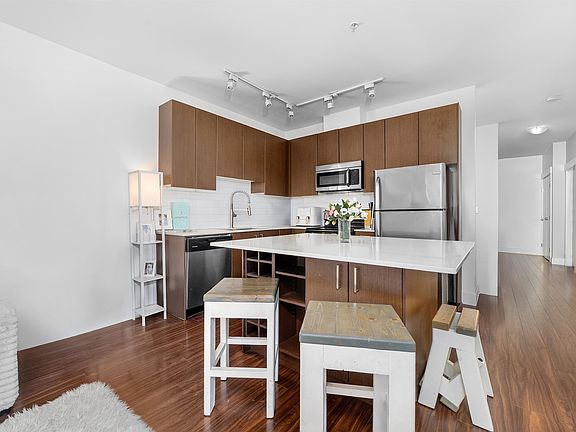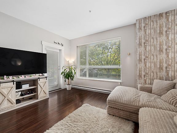 Welcome to La Via! This spacious 2 bed, 2 bath ground floor condo offers over 1,000 sqft of well-designed living with 9ft ceilings and modern finishes. The bright, south-facing layout features a stylish kitchen with quartz countertops and a large island, perfect for entertaining. Enjoy the convenience of your own private patio with separate entrance - ideal for easy access and extra outdoor living space. Complete with 1 parking stall and storage locker, this home checks all the boxes. Located in the heart of Port Coquitlam, you’re just steps to the rec center, shopping, parks, and transit, including the West Coast Express for quick commutes. A perfect blend of comfort, style, and convenience!