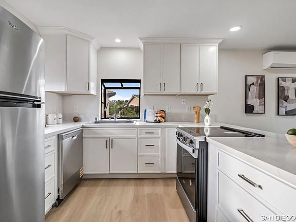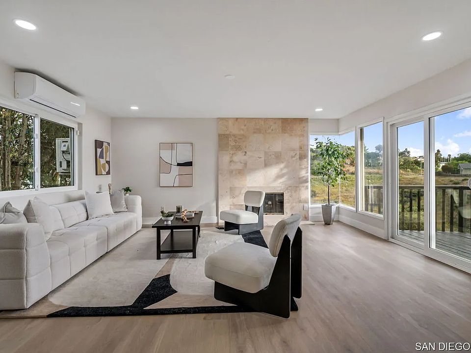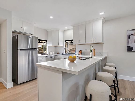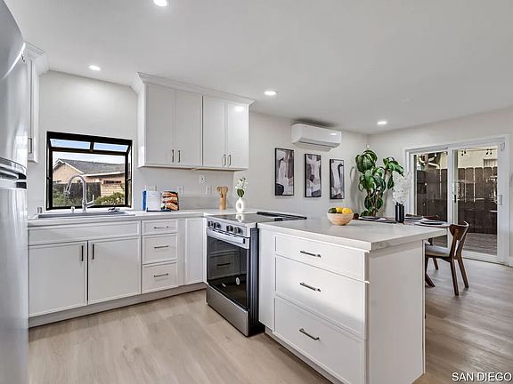 PRICE IMPROVEMENT!!! Seller Credit available for Rate Buydown! VA Approved! Enjoy panoramic views of downtown San Diego, the Coronado Bay Bridge, and Point Loma from nearly every room in this beautifully updated home. Expansive two-level balconies and a backyard deck with low-maintenance turf provide ideal spaces to soak in San Diego's signature sunshine. This move-in-ready residence has been thoughtfully upgraded throughout, featuring all-new zoned HVAC systems in each room, dual-pane windows, fresh paint, new flooring, updated tile around the fireplace, and a fully renovated kitchen and bathrooms. The kitchen showcases sleek white stone countertops, stainless steel appliances, a new range and dishwasher, and a clean, modern aesthetic. Enjoy al fresco dining on the deck or unwind on the private balcony off the primary suite while taking in sunset views over the Bay Bridge. Evening brings the sparkle of city lights, and the kitchen's sunny windows are perfect for growing fresh herbs. Centrally located just minutes from downtown San Diego, Chula Vista, the College Area, and La Mesa, this home offers easy access to top dining, shopping, entertainment, and major freeways. The community also includes a nearby park ideal for weekend picnics and outdoor enjoyment, just steps from your front door.null