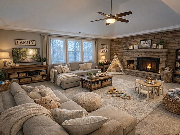 Stunning stone fireplaceHuge family roomAll stainless-steel appliancesSpacious dining area
